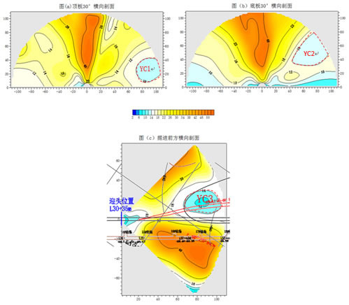 成果解釋:頂板30°方向右側(cè)存在一個(gè)相對(duì)低阻區(qū)YC1.分析為砂巖水影響所致;底板30°方向存在一個(gè)低阻異常區(qū)YC2,結(jié)合地質(zhì)資料分析低阻區(qū)位于砂巖層位,該低阻區(qū)為砂巖水影響所致;YC3低阻區(qū)主要受NF114正斷層影響,該區(qū)域裂隙發(fā)育導(dǎo)致砂巖水局部富集,從而形成相對(duì)低阻區(qū)域。