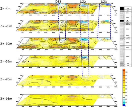 成果解釋:本次為工作面底板富水性探測(cè),工作面底板下55m為太原組灰?guī)r層位;共有3個(gè)低阻異常區(qū),其中DZ1和DZ3主要發(fā)育在砂巖層位;DZ2向下發(fā)育深度為70m,進(jìn)入灰?guī)r層位,分析該低阻區(qū)與灰?guī)r水有一定的水力聯(lián)系。