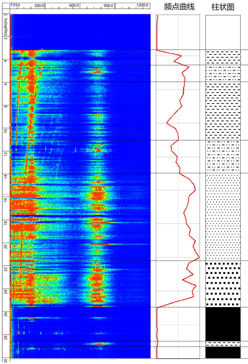 利用近源三分量傳感器采集破巖地震記錄,經(jīng)波譜分析,其低頻譜為轉(zhuǎn)速、鉆桿擺動等,其高頻譜與巖性對應,將高頻進行曲線歸一化,獲得鉆進巖性分層信息。