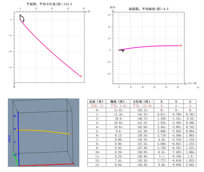 某礦鉆孔軌跡儀平面圖、剖面圖、三維圖和數(shù)據(jù)表