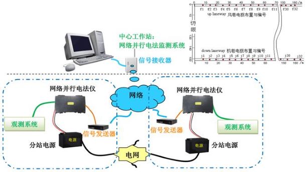 主要設(shè)備:并行電法監(jiān)測主機、帶電源的工控機、井下通信網(wǎng)絡(luò)、儀器配套電纜大線、無窮遠接線、不銹鋼電極、銅錘、卷尺等。