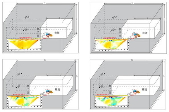 由于水的滲流造成電阻率明顯降低,供電電流明顯升高,自然電場、一次場電位遠(yuǎn)高于未充水介質(zhì)中的電位,且電位極值位置也指示滲流的到達(dá)位置,即隨著滲流時(shí)間的推移,電極電位和供電電流為上升狀態(tài)。因此,通過對地電場的監(jiān)測可以直觀地得到巷道掘進(jìn)前方介質(zhì)的富水狀況、滲流速度、滲流飽和狀態(tài)等動態(tài)變化情況。水的滲流造成了地電場異常,故可通過監(jiān)測地電場異常,從而達(dá)到對巷道掘進(jìn)過程中頂、底板水害的預(yù)警。下圖為巷道掘進(jìn)過程中不同時(shí)間段的智能電法超前探測(監(jiān)測)的視電阻率剖面示意圖。