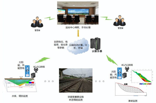 并行電法云監(jiān)測(cè)系統(tǒng)是基于國家發(fā)明專利(ZL200410014020、ZL201510120120.X)而研制的最新數(shù)字化產(chǎn)品,該系統(tǒng)采用高效率、大數(shù)據(jù)、泛裝置的地電場(chǎng)同步采集技術(shù),并結(jié)合物聯(lián)網(wǎng)技術(shù)、5G傳輸、云端處理、深度學(xué)習(xí)等手段,推動(dòng)了直流電法由傳統(tǒng)單次探測(cè)功能向“遠(yuǎn)程采集、云端存儲(chǔ)、時(shí)變處理、動(dòng)態(tài)預(yù)警”方向轉(zhuǎn)變的新發(fā)展,實(shí)現(xiàn)了“采集在現(xiàn)場(chǎng),傳輸在5G,存儲(chǔ)在云端,控制在手上,顯示在工地,深度處理在管理中心”的功能,為數(shù)字工程建設(shè)提供了重要的技術(shù)支撐。
