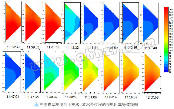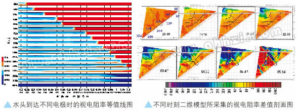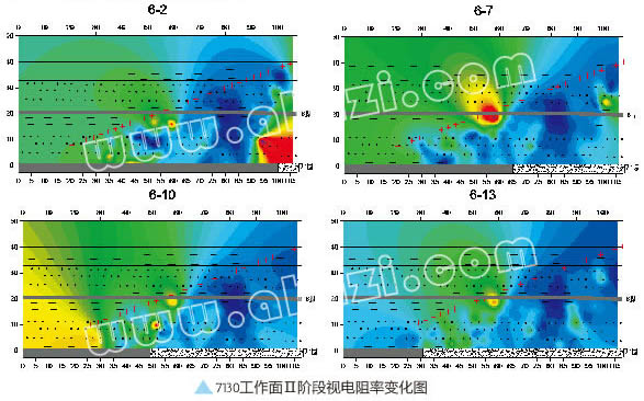 當(dāng)工作面進(jìn)入監(jiān)測(cè)區(qū)域時(shí),視電阻率能直觀反映當(dāng)時(shí)鉆孔所在區(qū)域的巖層的視電阻率分布情況。如圖d所示,為不同時(shí)間段視電阻率等值線圖。從圖中可以看出視電阻率低時(shí),涌水量增加,視電阻率增高時(shí),涌水量減少。