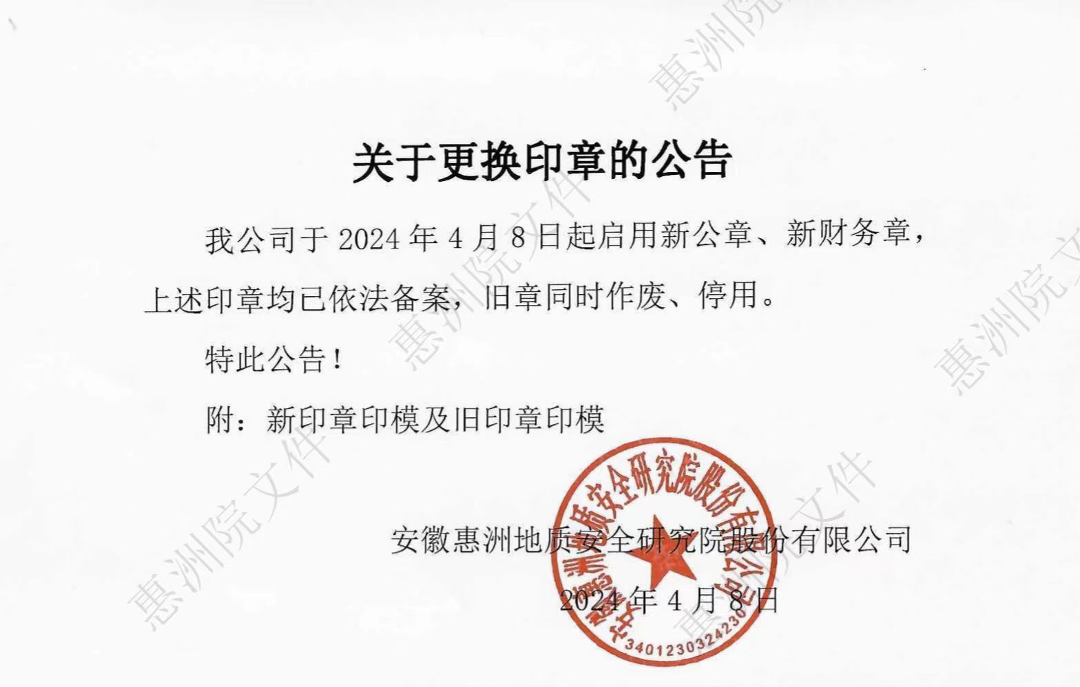 我公司于2024年4月8日起啟用新公章、新財務章,上述印章均已依法備案,舊章同時作廢、停用。