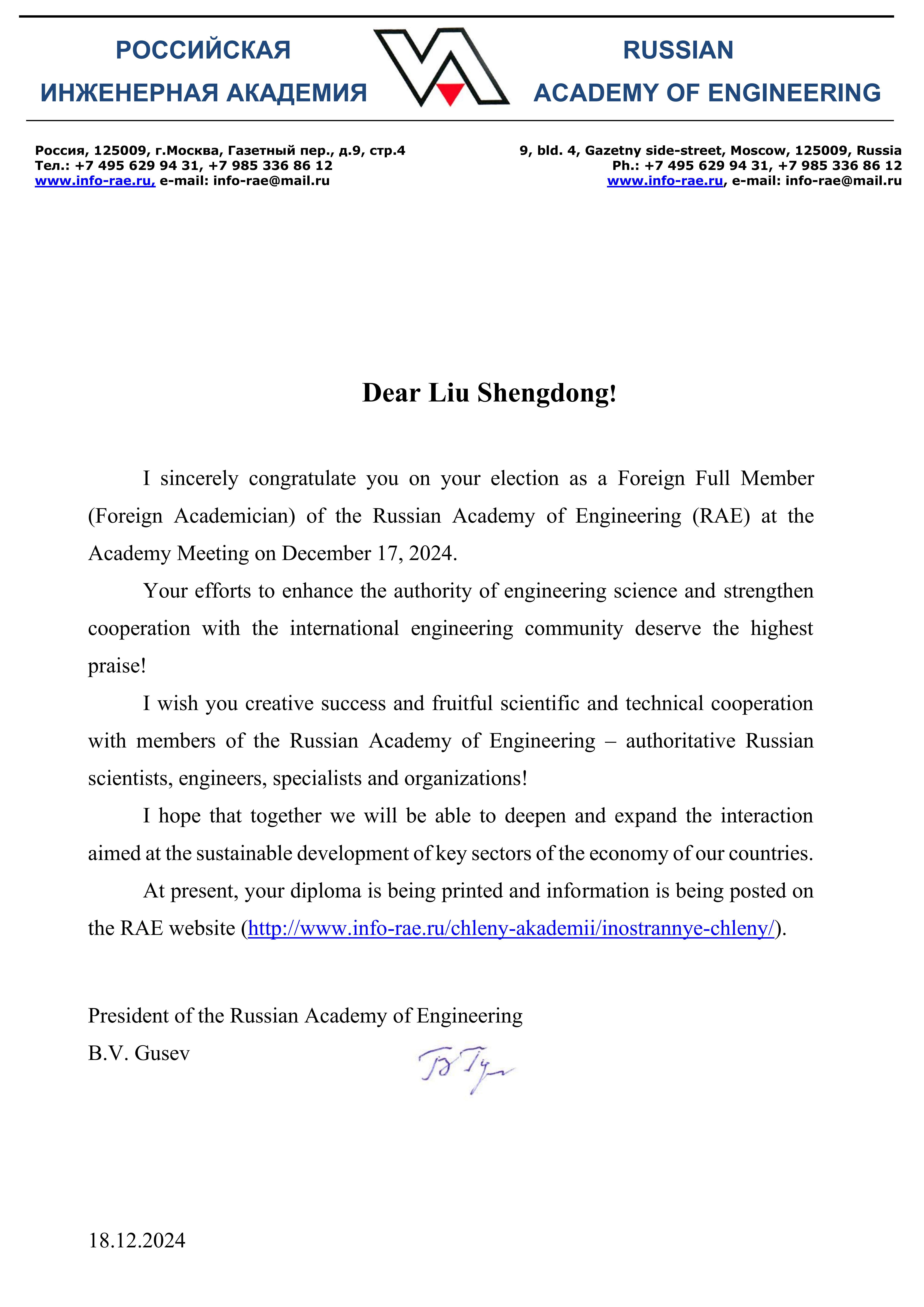 經(jīng)俄羅斯工程院院士推薦,通過形式審查、材料審核、專家委員會(huì)的審核等流程,劉盛東教授在2024年12月17日舉行的俄羅斯工程院(RAE)院士大會(huì)上當(dāng)選為俄羅斯工程院外籍院士。12月18日,俄羅斯工程院(Russian Academy of Engineering,RAE)B.V.Gusev院長向劉盛東教授發(fā)來賀信,祝賀他當(dāng)選成為俄羅斯工程院外籍院士,希望未來他為中俄兩國的可持續(xù)發(fā)展開展創(chuàng)造性和富有成效的科學(xué)技術(shù)合作。