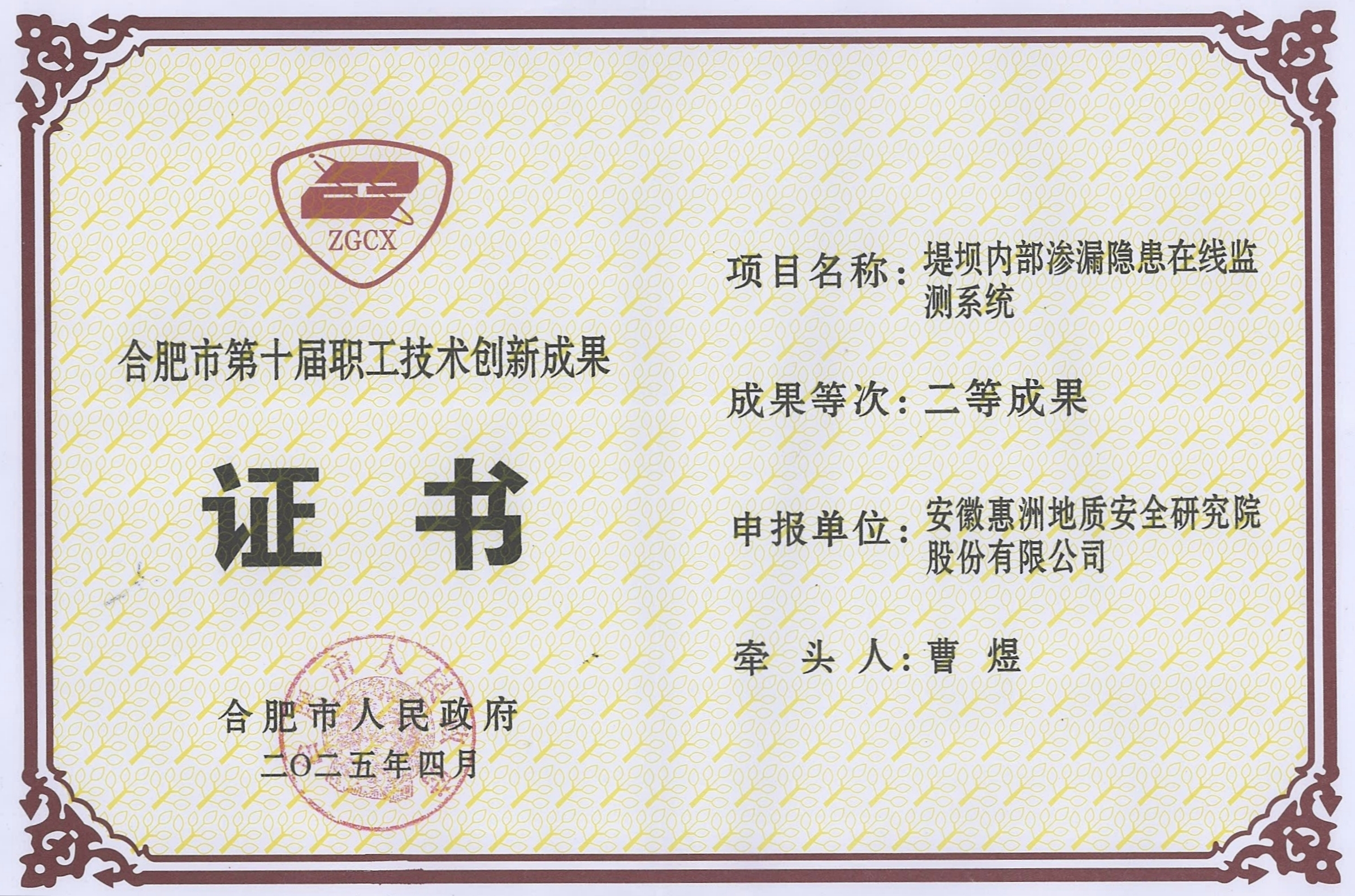 4月30日,合肥市第十屆職工技術(shù)創(chuàng)新成果評(píng)選結(jié)果正式揭曉,惠洲院總工程師曹煜牽頭的“堤壩內(nèi)部滲漏隱患在線監(jiān)測(cè)系統(tǒng)”項(xiàng)目榮獲合肥市第十屆職工技術(shù)創(chuàng)新成果二等獎(jiǎng)。